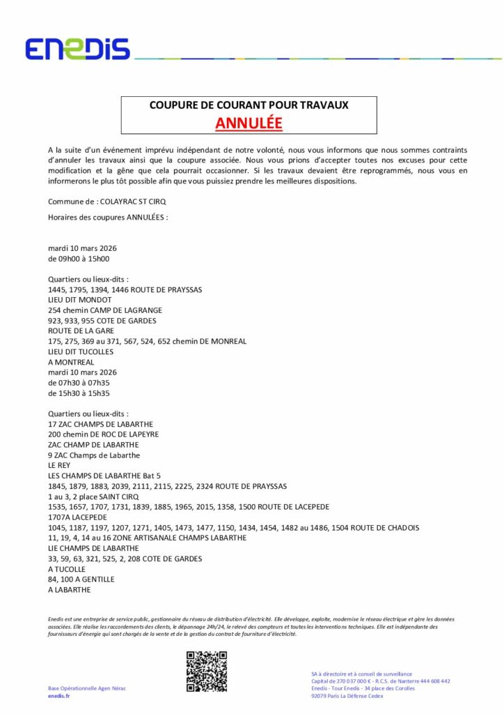 ENEDIS ANNULATION D’UNE COUPURE DE COURANT SUR LES SECTEURS SUIVANTS