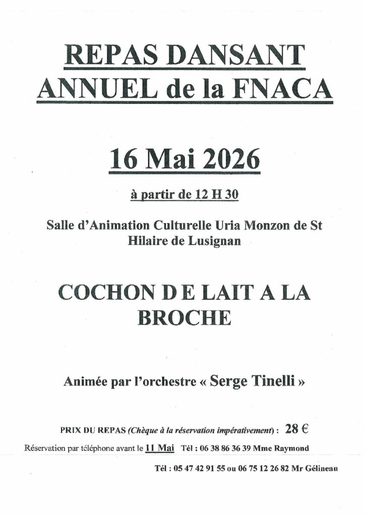 LA FNACA VOUS PROPOSE LE 16 MAI UN REPAS DANSANT