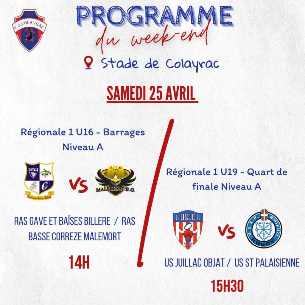 PROGRAMME DU COC RUGBY POUR LE WEEK DU 25 AVRIL ET 26 AVRIL 2026