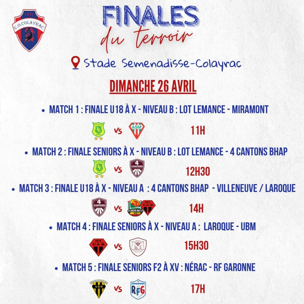 Ce week-end, le COC reçoit deux matchs de phases finales (cadets et juniors) au stade municipal ainsi que cinq finales du terroir féminines ( Stade Semenadisse ) 🏉